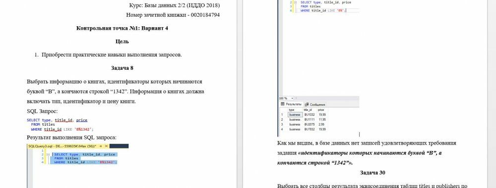 Выбрать информацию о книгах, идентификаторы которых начинаются буквой “B”, а кончаются строкой “1342”. Информация о книгах должна включать тип, идентификатор и цену книги.