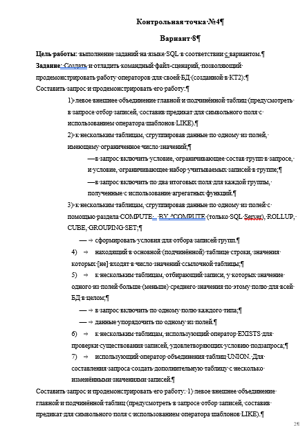 Контрольная точка №4 Вариант 8 Цель работы: выполнение заданий на языке SQL в соответствии с вариантом. Задание: Создать и отладить командный файл-сценарий, позволяющий продемонстрировать работу операторов для своей БД (созданной в КТ2): Составить за