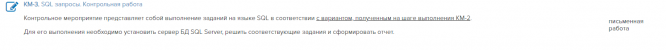 Контрольное мероприятие представляет собой выполнение заданий на языке SQL в соответствии с вариантом, полученным на шаге выполнения КМ-2.