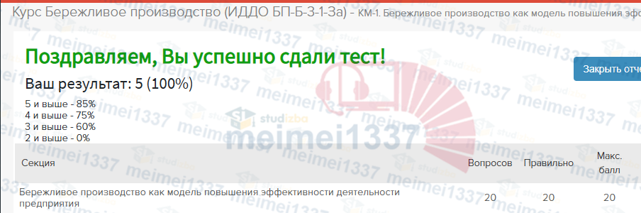 Курс Бережливое производство - КМ-1. Бережливое производство как модель повышения эффективности. Тестирование