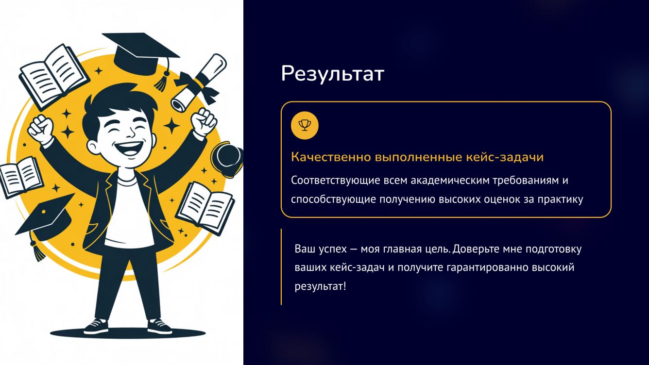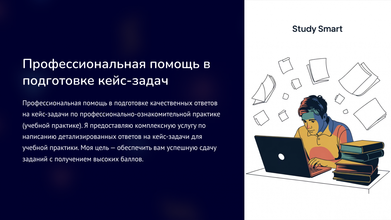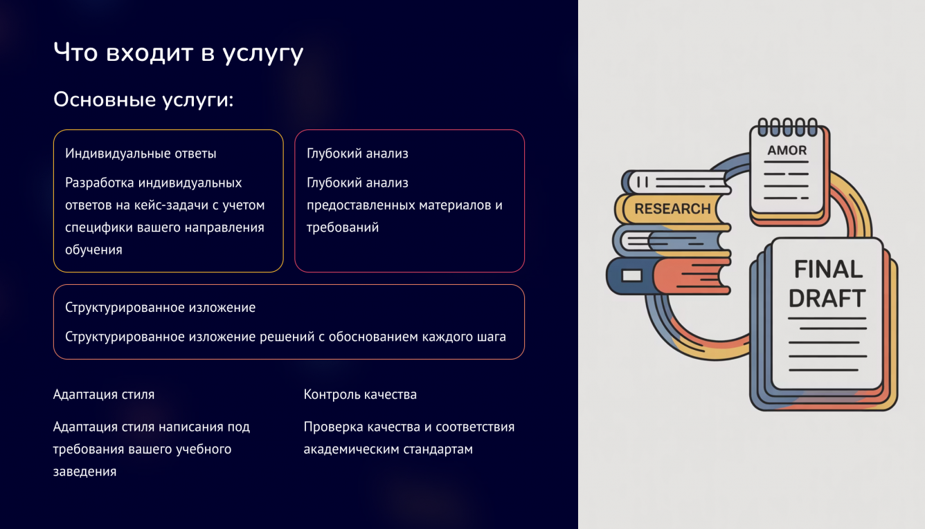 Я предоставляю комплексную услугу по написанию детализированных ответов на кейс-задачи для учебной практики. Моя цель — обеспечить вам успешную сдачу заданий с получением высоких баллов.