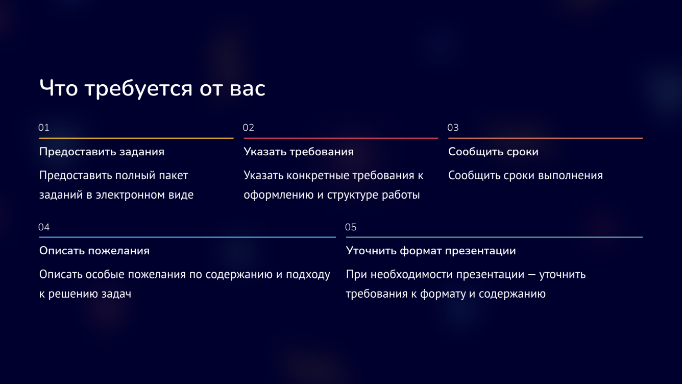 • Описать особые пожелания по содержанию и подходу к решению задач