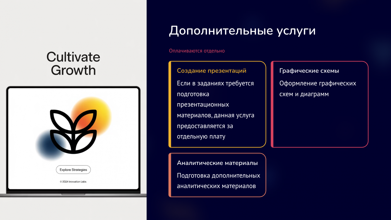 • Создание презентаций — если в заданиях требуется подготовка презентационных материалов, данная услуга предоставляется за отдельную плату