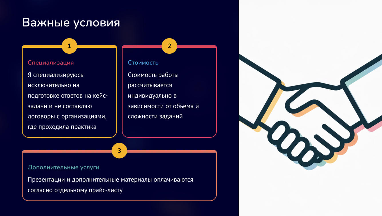 • Я специализируюсь исключительно на подготовке ответов на кейс-задачи и не составляю договоры с организациями, где проходила практика