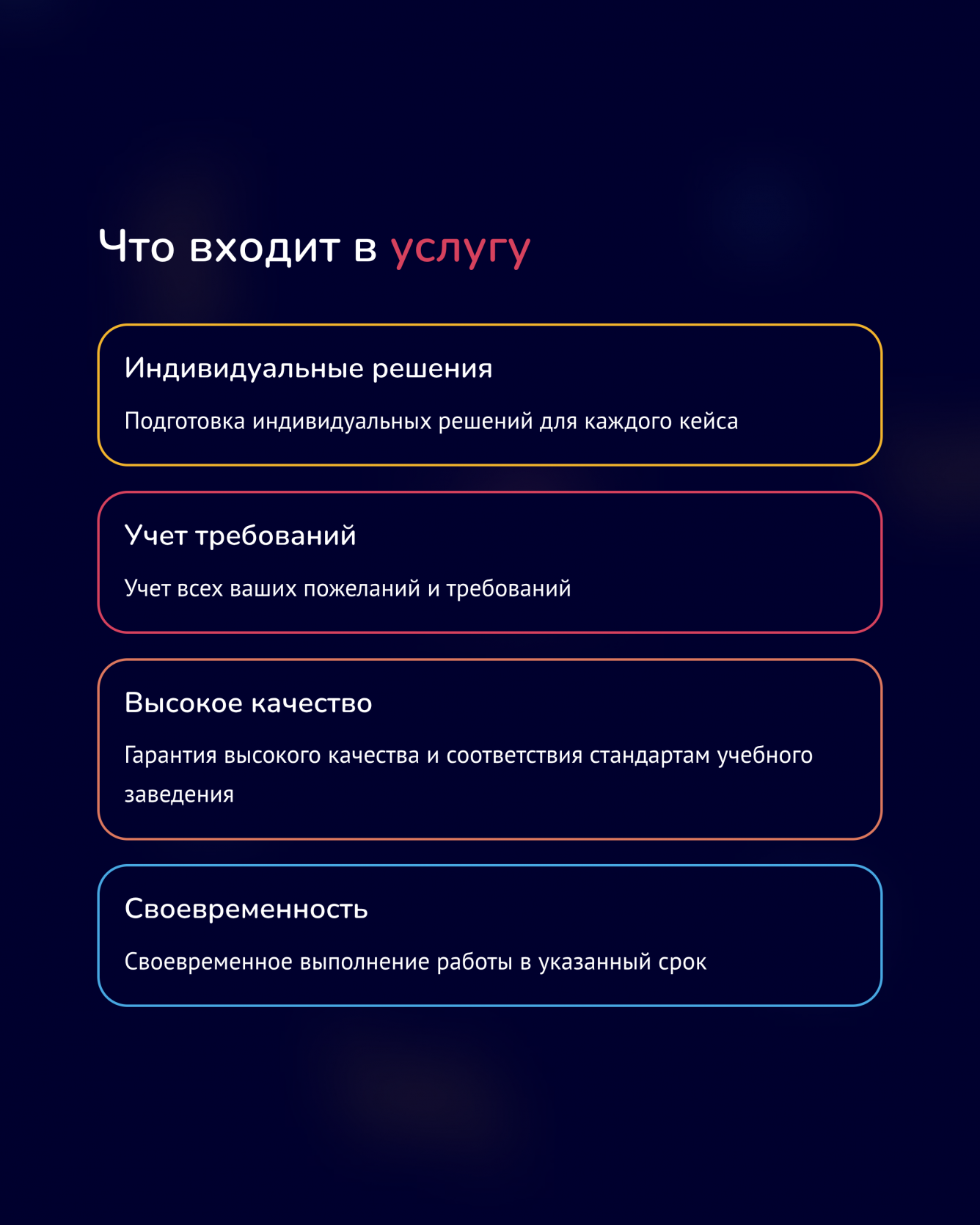 Студенческие услуги высокого качества: презентации, кейсы, курсовые проекты. Опыт работы с ведущими вузами. Соблюдение сроков и требований. Индивидуальный подход к каждому заказу.