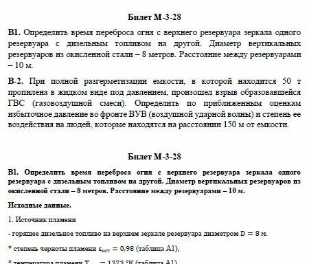 В1. Определить время переброса огня с верхнего резервуара зеркала одного резервуара с дизельным топливом на другой. Диаметр вертикальных резервуаров из окисленной стали – 8 метров. Расстояние между резервуарами – 10 м.
