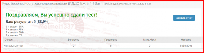 Для студентов ИДДО НИУ «МЭИ» по предмету Безопасность жизнедеятельности (БЖД и ГРОБ или ОБЖ)Полный курс Итоговый тест - 89%Полный курс Итоговый тест - 89%