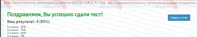 Для студентов ИДДО НИУ «МЭИ» по предмету Безопасность жизнедеятельности (БЖД и ГРОБ или ОБЖ)Курс Безопасность жизнедеятельности - КМ-4. Пожарная безопасность. Чрезвычайные ситуации. ТестированиеКурс Безопасность жизнедеятельности - КМ-4. Пожарная безопасность. Чрезвычайные ситуации. Тестирование