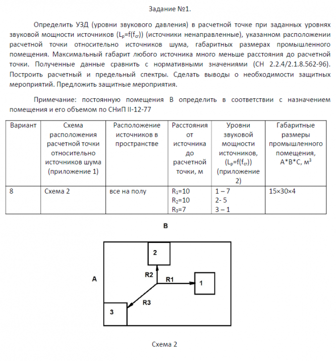 Определить УЗД (уровни звукового давления) в расчетной точке при заданных уровнях звуковой мощности источников (Lp=f(fсг)) (источники ненаправленные), указанном расположении расчетной точки относительно источников шума, габаритных размерах промышленного помещения. Максимальный габарит любого источника много меньше расстояния до расчетной точки. Полученные данные сравнить с нормативными значениями (СН 2.2.4/2.1.8.562-96). Построить расчетный и предельный спектры. Сделать выводы о необходимости защитных мероприятий. Предложить защитные мероприятия. Примечание: постоянную помещения В определить в соответствии с назначением помещения и его объемом по СНиП II-12-77...