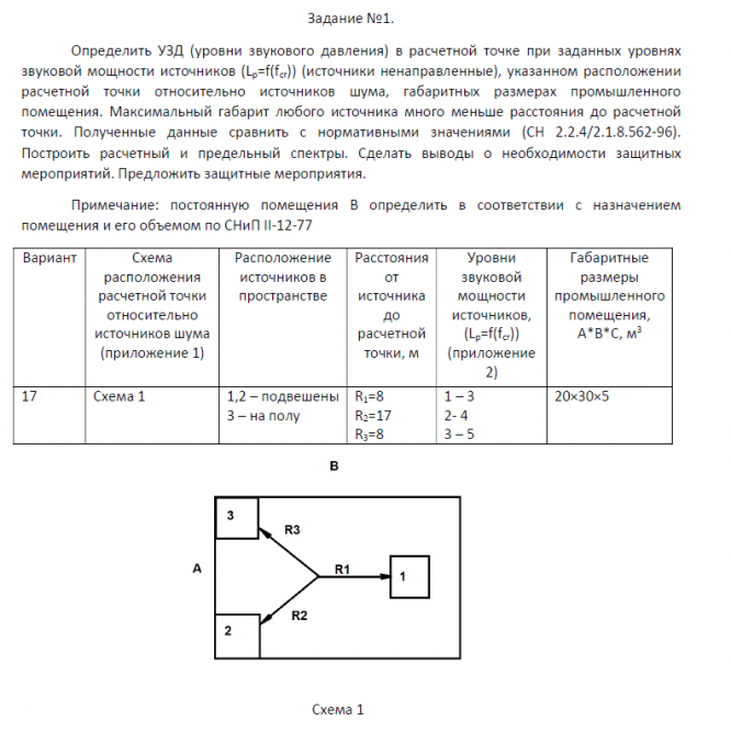 Определить УЗД (уровни звукового давления) в расчетной точке при заданных уровнях звуковой мощности источников (Lp=f(fсг)) (источники ненаправленные), указанном расположении расчетной точки относительно источников шума, габаритных размерах промышленного помещения. Максимальный габарит любого источника много меньше расстояния до расчетной точки. Полученные данные сравнить с нормативными значениями (СН 2.2.4/2.1.8.562-96). Построить расчетный и предельный спектры. Сделать выводы о необходимости защитных мероприятий. Предложить защитные мероприятия. Примечание: постоянную помещения В определить в соответствии с назначением помещения и его объемом по СНиП II-12-77...