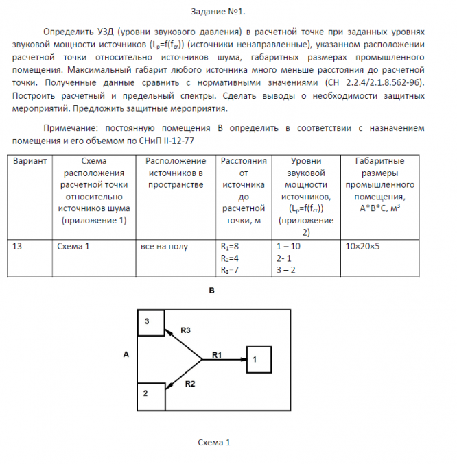 Определить УЗД (уровни звукового давления) в расчетной точке при заданных уровнях звуковой мощности источников (Lp=f(fсг)) (источники ненаправленные), указанном расположении расчетной точки относительно источников шума, габаритных размерах промышленного помещения. Максимальный габарит любого источника много меньше расстояния до расчетной точки. Полученные данные сравнить с нормативными значениями (СН 2.2.4/2.1.8.562-96). Построить расчетный и предельный спектры. Сделать выводы о необходимости защитных мероприятий. Предложить защитные мероприятия. Примечание: постоянную помещения В определить в соответствии с назначением помещения и его объемом по СНиП II-12-77...