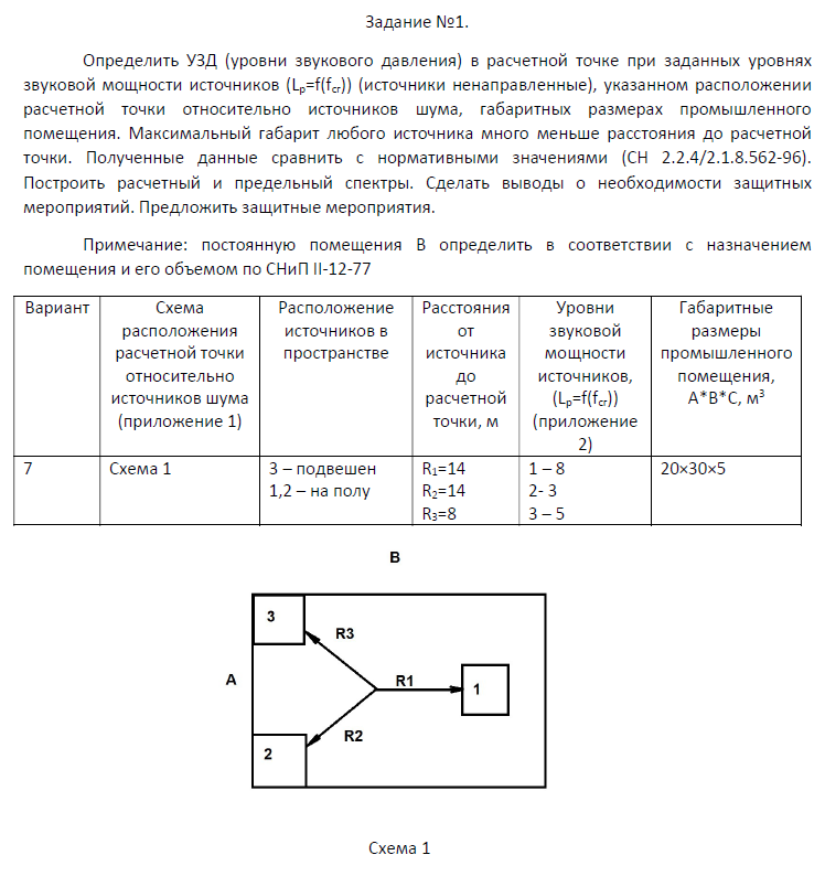 Определить УЗД (уровни звукового давления) в расчетной точке при заданных уровнях звуковой мощности источников (Lp=f(fсг)) (источники ненаправленные), указанном расположении расчетной точки относительно источников шума, габаритных размерах промышленного помещения. Максимальный габарит любого источника много меньше расстояния до расчетной точки. Полученные данные сравнить с нормативными значениями (СН 2.2.4/2.1.8.562-96). Построить расчетный и предельный спектры. Сделать выводы о необходимости защитных мероприятий. Предложить защитные мероприятия. Примечание: постоянную помещения В определить в соответствии с назначением помещения и его объемом по СНиП II-12-77...
