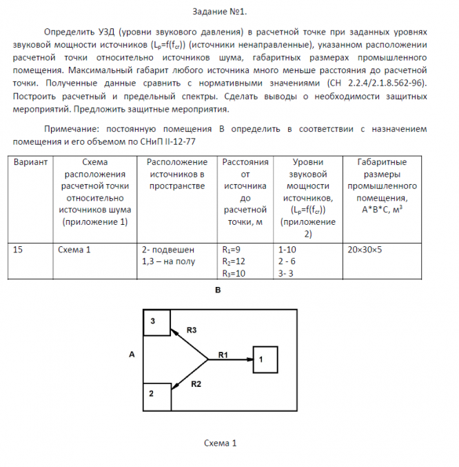Определить УЗД (уровни звукового давления) в расчетной точке при заданных уровнях звуковой мощности источников (Lp=f(fсг)) (источники ненаправленные), указанном расположении расчетной точки относительно источников шума, габаритных размерах промышленного помещения. Максимальный габарит любого источника много меньше расстояния до расчетной точки. Полученные данные сравнить с нормативными значениями (СН 2.2.4/2.1.8.562-96). Построить расчетный и предельный спектры. Сделать выводы о необходимости защитных мероприятий. Предложить защитные мероприятия. Примечание: постоянную помещения В определить в соответствии с назначением помещения и его объемом по СНиП II-12-77...