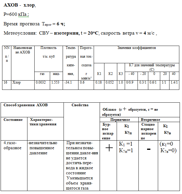 В резервуаре на ХОО под давлением 600 кПа в виде газа хранится хлор. Размеры шарообразного резервуара: диаметр 11,5 м. Дать прогноз химической обстановки на 6 ч после разрушения резервуара. Метеоусловия: СВУ - изотермия, температура 20 град.С, ветер 4 м/с.