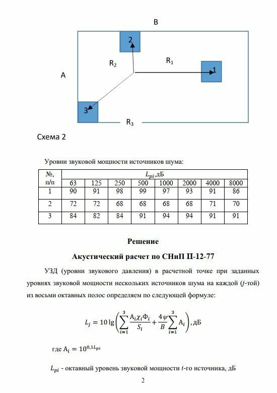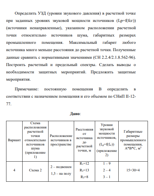Определить УЗД (уровни звукового давления) в расчетной точке при заданных уровнях звуковой мощности источников (Lp=f(f сг )) (источники ненаправленные), указанном расположении расчетной точки относительно источников шума, габаритных размерах промышленного помещения. Максимальный габарит любого источника много меньше расстояния до расчетной точки. Полученные данные сравнить с нормативными значениями (СН 2.2.4/2.1.8.562-96). Построить расчетный и предельный спектры. Сделать выводы о необходимости защитных мероприятий. Предложить защитные мероприятия. Примечание: постоянную помещения В определить в соответствии с назначением помещения и его объемом по СНиП II-12-77 .