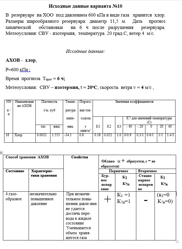 В резервуаре на ХОО под давлением 600 кПа в виде газа хранится хлор. Размеры шарообразного резервуара: диаметр 11,5 м. Дать прогноз химической обстановки на 6 ч после разрушения резервуара. Метеоусловия: СВУ - изотермия, температура 20 град.С, ветер 4 м/с.