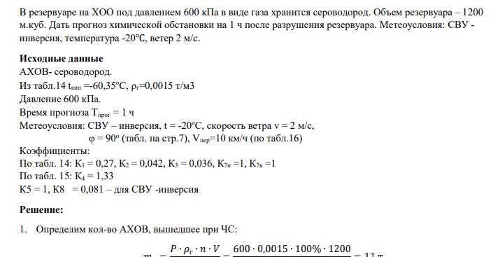 В резервуаре на ХОО под давлением 600 кПа в виде газа хранится сероводород. Объем резервуара – 1200 м.куб. Дать прогноз химической обстановки на 1 ч после разрушения резервуара. Метеоусловия: СВУ - инверсия, температура -20℃, ветер 2 м/с.