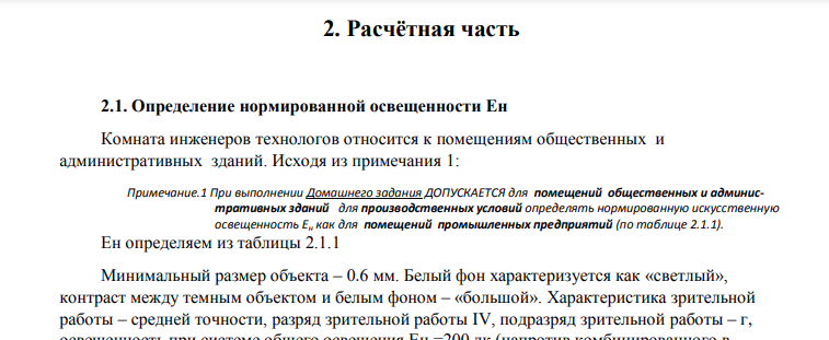 Характеристика помещения: Тип помещения - Комната начальника цеха; Габариты помещения, м (длина х ширина х высота) 5х4х3; Характеристика зрительных работ: Вид работ – Документы; Размер объекта, мм – 0,6; Цвет объекта – Черный; Цвет фона – Белый.