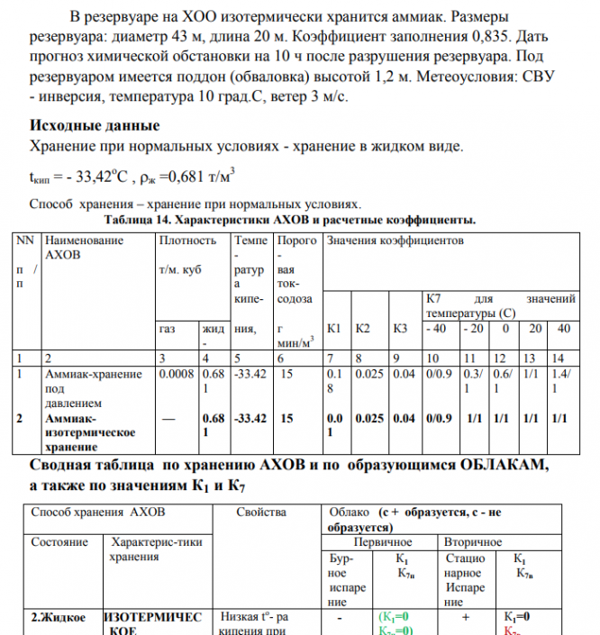 В резервуаре на ХОО изотермически хранится аммиак. Размеры резервуара: диаметр 43 м, длина 20 м. Коэффициент заполнения 0,835. Дать прогноз химической обстановки на 10 ч после разрушения резервуара. Под резервуаром имеется поддон (обваловка) высотой 1,2 м. Метеоусловия: СВУ - инверсия, температура 10 град.С, ветер 3 м/с. ​​​​