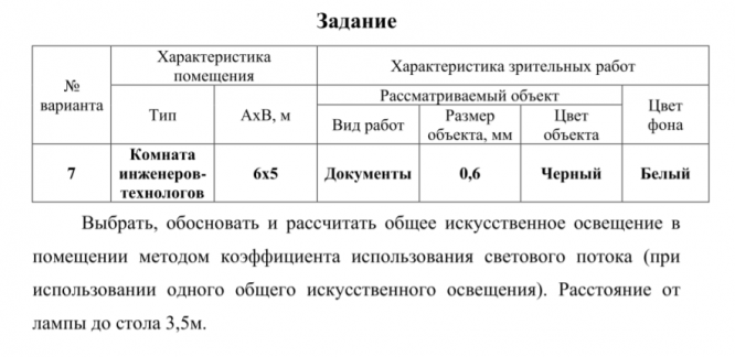 ДЗ 2: Расчет искусственного освещения, Вариант 7