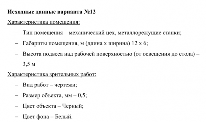 ДЗ 2: Расчет искусственного освещения, Вариант 12