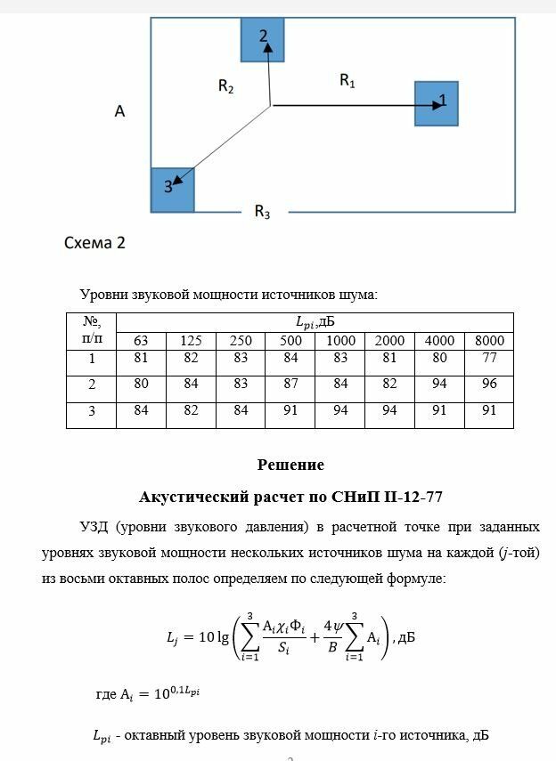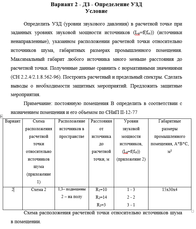 Определить УЗД (уровни звукового давления) в расчетной точке при заданных уровнях звуковой мощности источников (Lp=f(fсг)) (источники ненаправленные), указанном расположении расчетной точки относительно источников шума, габаритных размерах промышленного помещения. Максимальный габарит любого источника много меньше расстояния до расчетной точки. Полученные данные сравнить с нормативными значениями (СН 2.2.4/2.1.8.562-96). Построить расчетный и предельный спектры. Сделать выводы о необходимости защитных мероприятий. Предложить защитные мероприятия.
