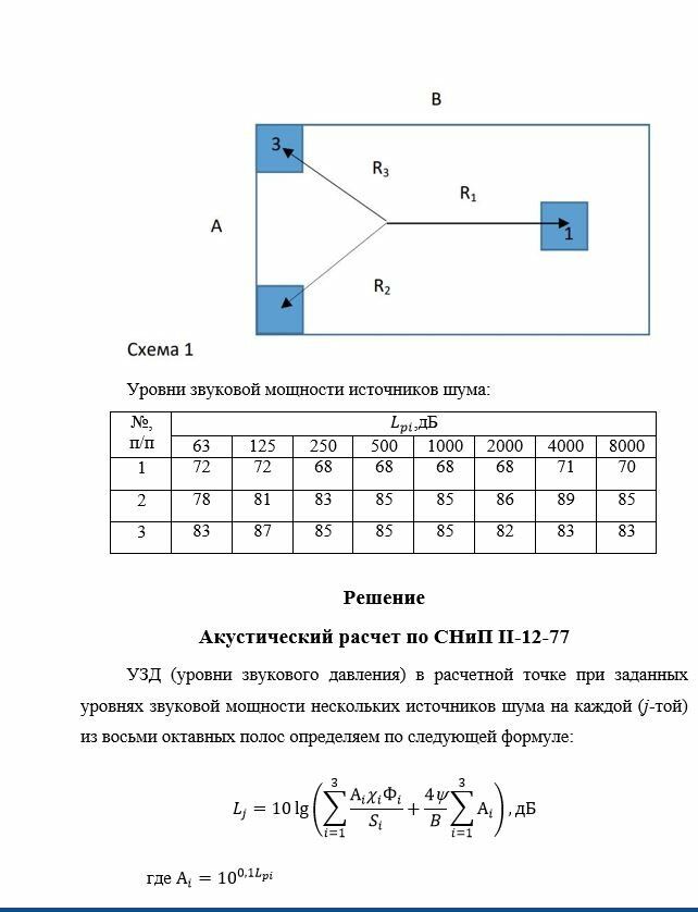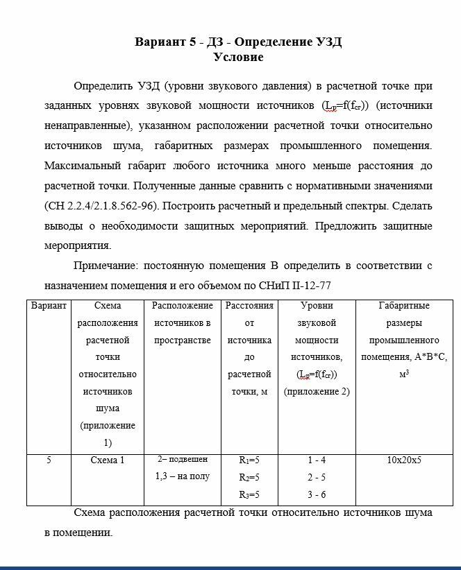 Определить УЗД (уровни звукового давления) в расчетной точке при заданных уровнях звуковой мощности источников (Lp=f(fсг)) (источники ненаправленные), указанном расположении расчетной точки относительно источников шума, габаритных размерах промышленного помещения. Максимальный габарит любого источника много меньше расстояния до расчетной точки. Полученные данные сравнить с нормативными значениями (СН 2.2.4/2.1.8.562-96). Построить расчетный и предельный спектры. Сделать выводы о необходимости защитных мероприятий. Предложить защитные мероприятия.