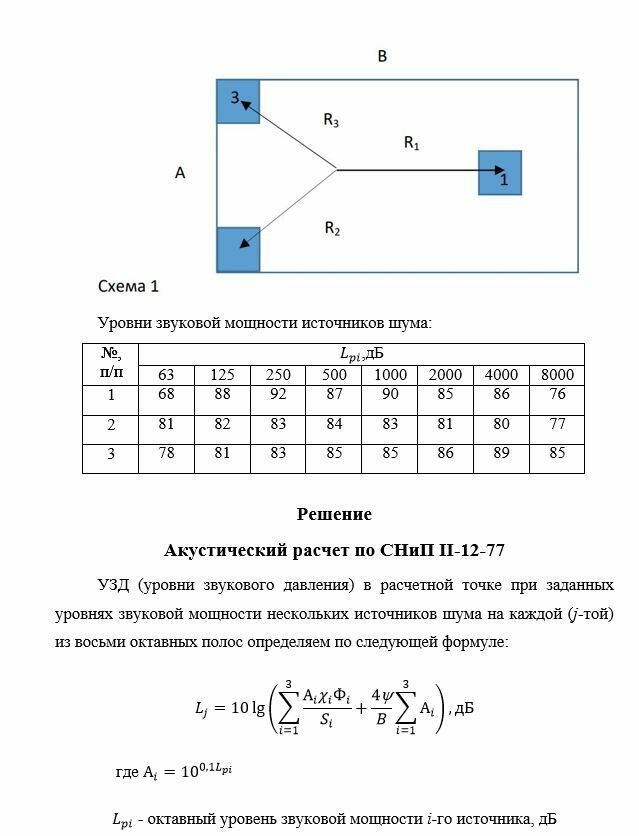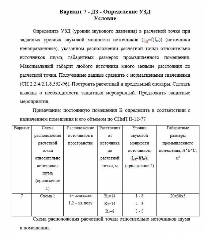Определить УЗД (уровни звукового давления) в расчетной точке при заданных уровнях звуковой мощности источников (Lp=f(fсг)) (источники ненаправленные), указанном расположении расчетной точки относительно источников шума, габаритных размерах промышленного помещения. Максимальный габарит любого источника много меньше расстояния до расчетной точки. Полученные данные сравнить с нормативными значениями (СН 2.2.4/2.1.8.562-96). Построить расчетный и предельный спектры. Сделать выводы о необходимости защитных мероприятий. Предложить защитные мероприятия.