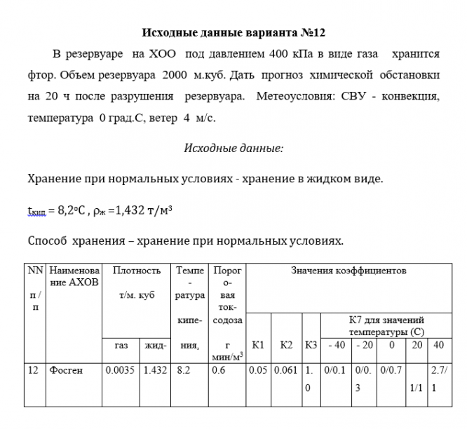 В резервуаре на ХОО под давлением 400 кПа в виде газа хранится фтор. Объем резервуара 2000 м.куб. Дать прогноз химической обстановки на 20 ч после разрушения резервуара. Метеоусловия: СВУ - конвекция, температура 0 град.С, ветер 4 м/с.