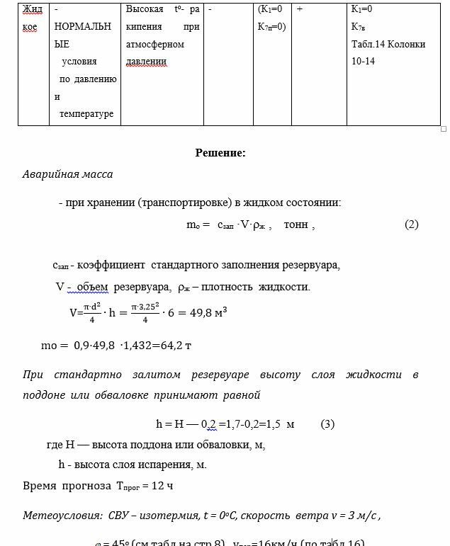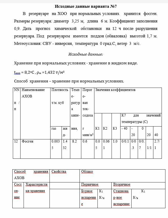 В резервуаре на ХОО при нормальных условиях хранится фосген. Размеры резервуара: диаметр 3,25 м, длина 6 м. Коэффициент заполнения 0,9. Дать прогноз химической обстановки на 12 ч после разрушения резервуара. Под резервуаром имеется поддон (обваловка) высотой 1,7 м. Метеоусловия: СВУ - инверсия, температура 0 град.С, ветер 3 м/с.
