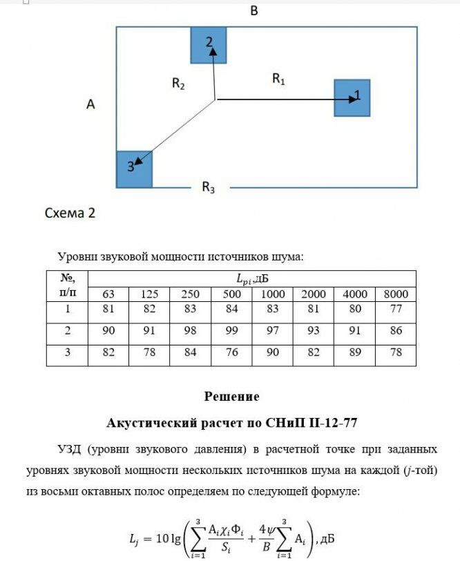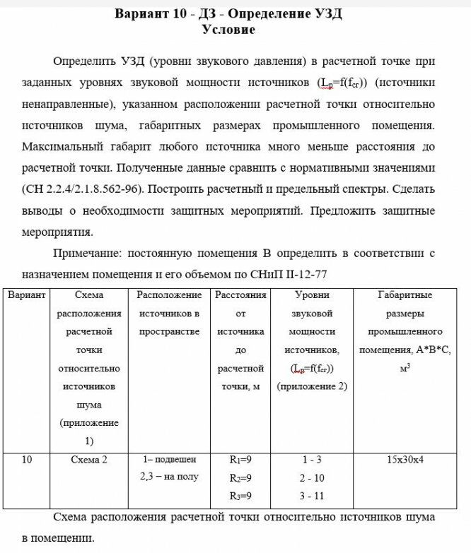 Определить УЗД (уровни звукового давления) в расчетной точке при заданных уровнях звуковой мощности источников (Lp=f(fсг)) (источники ненаправленные), указанном расположении расчетной точки относительно источников шума, габаритных размерах промышленного помещения. Максимальный габарит любого источника много меньше расстояния до расчетной точки. Полученные данные сравнить с нормативными значениями (СН 2.2.4/2.1.8.562-96). Построить расчетный и предельный спектры. Сделать выводы о необходимости защитных мероприятий. Предложить защитные мероприятия.