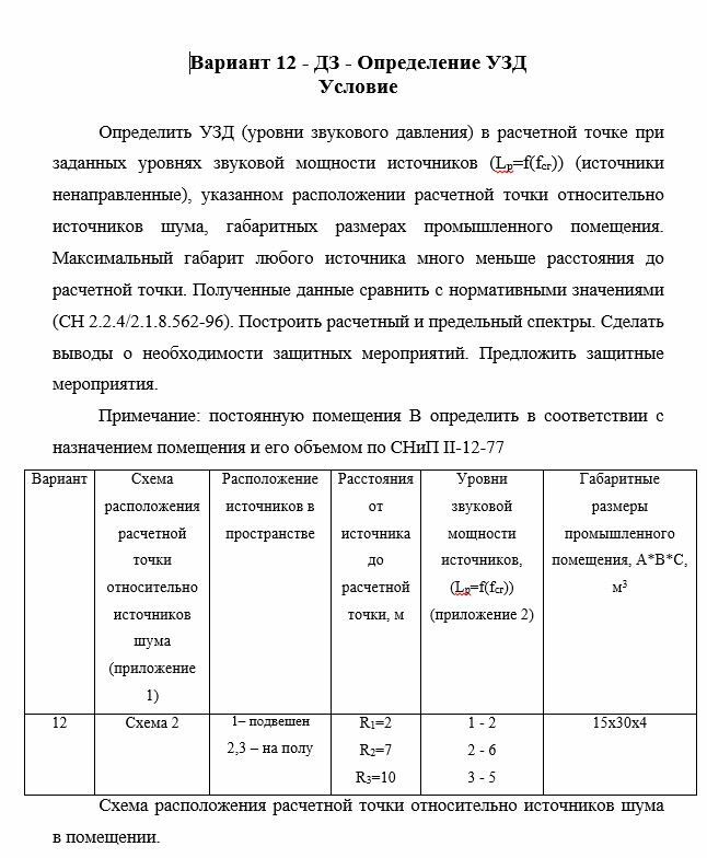 Определить УЗД (уровни звукового давления) в расчетной точке при заданных уровнях звуковой мощности источников (Lp=f(fсг)) (источники ненаправленные), указанном расположении расчетной точки относительно источников шума, габаритных размерах промышленного помещения. Максимальный габарит любого источника много меньше расстояния до расчетной точки. Полученные данные сравнить с нормативными значениями (СН 2.2.4/2.1.8.562-96). Построить расчетный и предельный спектры. Сделать выводы о необходимости защитных мероприятий. Предложить защитные мероприятия.