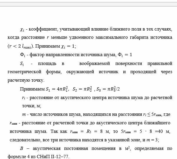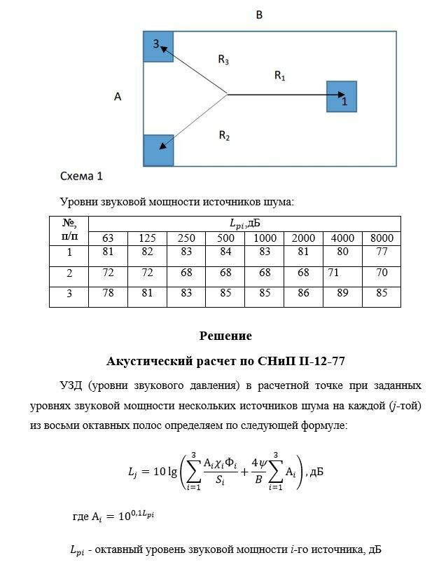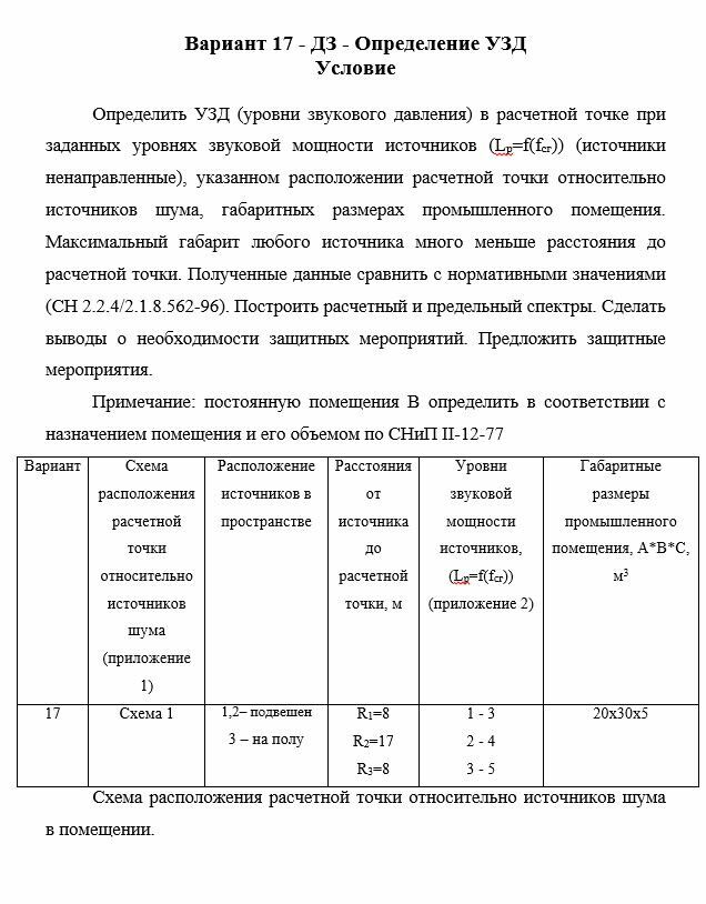 Определить УЗД (уровни звукового давления) в расчетной точке при заданных уровнях звуковой мощности источников (Lp=f(fсг)) (источники ненаправленные), указанном расположении расчетной точки относительно источников шума, габаритных размерах промышленного помещения. Максимальный габарит любого источника много меньше расстояния до расчетной точки. Полученные данные сравнить с нормативными значениями (СН 2.2.4/2.1.8.562-96). Построить расчетный и предельный спектры. Сделать выводы о необходимости защитных мероприятий. Предложить защитные мероприятия.
