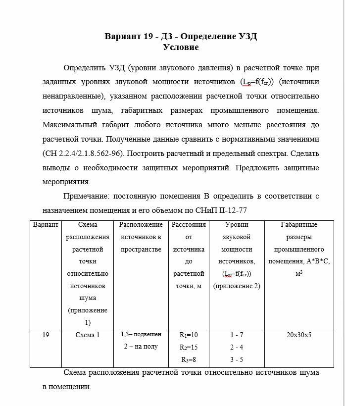 Определить УЗД (уровни звукового давления) в расчетной точке при заданных уровнях звуковой мощности источников (Lp=f(fсг)) (источники ненаправленные), указанном расположении расчетной точки относительно источников шума, габаритных размерах промышленного помещения. Максимальный габарит любого источника много меньше расстояния до расчетной точки. Полученные данные сравнить с нормативными значениями (СН 2.2.4/2.1.8.562-96). Построить расчетный и предельный спектры. Сделать выводы о необходимости защитных мероприятий. Предложить защитные мероприятия.