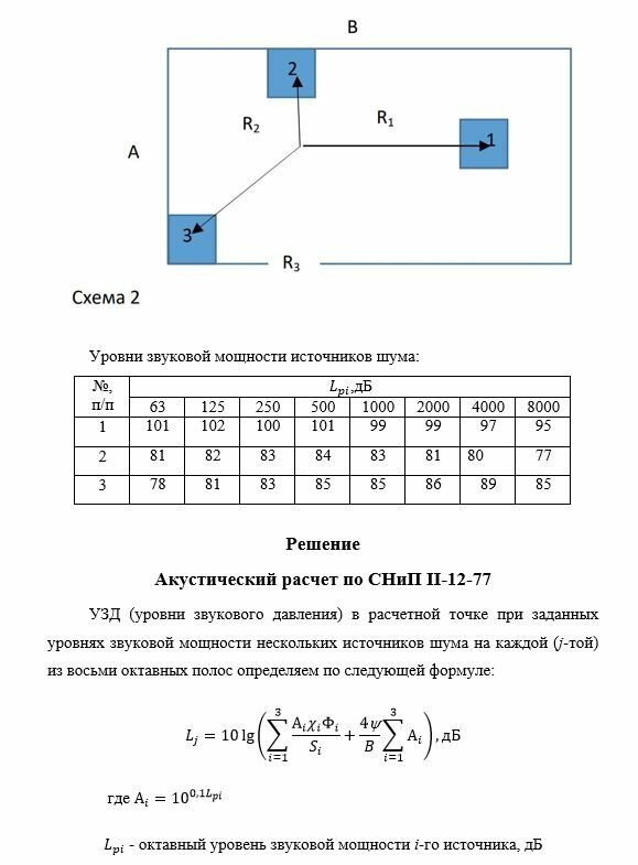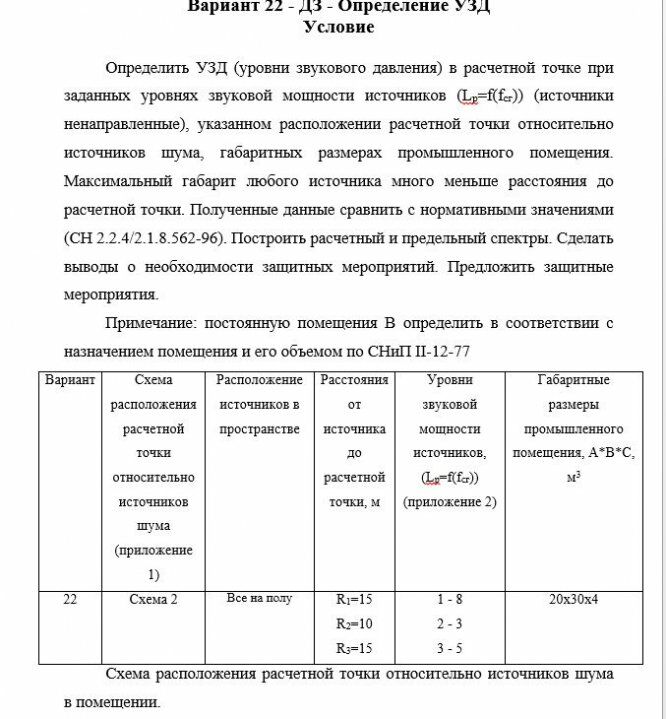 Определить УЗД (уровни звукового давления) в расчетной точке при заданных уровнях звуковой мощности источников (Lp=f(fсг)) (источники ненаправленные), указанном расположении расчетной точки относительно источников шума, габаритных размерах промышленного помещения. Максимальный габарит любого источника много меньше расстояния до расчетной точки. Полученные данные сравнить с нормативными значениями (СН 2.2.4/2.1.8.562-96). Построить расчетный и предельный спектры. Сделать выводы о необходимости защитных мероприятий. Предложить защитные мероприятия.