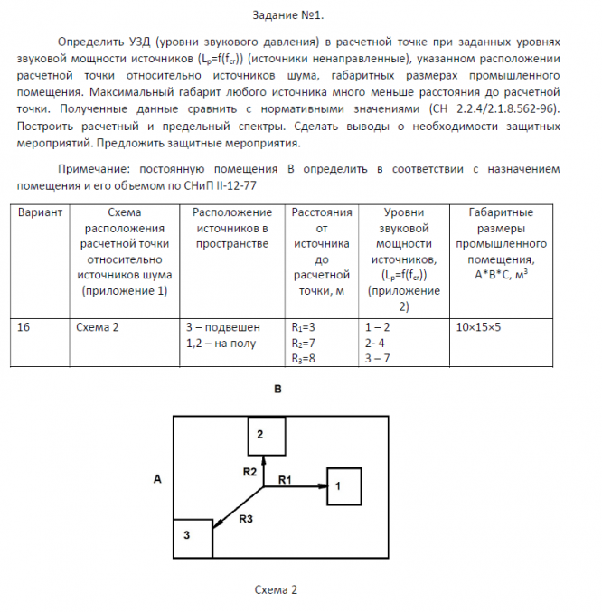 Определить УЗД (уровни звукового давления) в расчетной точке при заданных уровнях звуковой мощности источников (Lp=f(fсг)) (источники ненаправленные), указанном расположении расчетной точки относительно источников шума, габаритных размерах промышленного помещения. Максимальный габарит любого источника много меньше расстояния до расчетной точки. Полученные данные сравнить с нормативными значениями (СН 2.2.4/2.1.8.562-96). Построить расчетный и предельный спектры. Сделать выводы о необходимости защитных мероприятий. Предложить защитные мероприятия. Примечание: постоянную помещения В определить в соответствии с назначением помещения и его объемом по СНиП II-12-77...