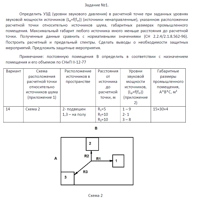 Определить УЗД (уровни звукового давления) в расчетной точке при заданных уровнях звуковой мощности источников (Lp=f(fсг)) (источники ненаправленные), указанном расположении расчетной точки относительно источников шума, габаритных размерах промышленного помещения. Максимальный габарит любого источника много меньше расстояния до расчетной точки. Полученные данные сравнить с нормативными значениями (СН 2.2.4/2.1.8.562-96). Построить расчетный и предельный спектры. Сделать выводы о необходимости защитных мероприятий. Предложить защитные мероприятия. Примечание: постоянную помещения В определить в соответствии с назначением помещения и его объемом по СНиП II-12-77...