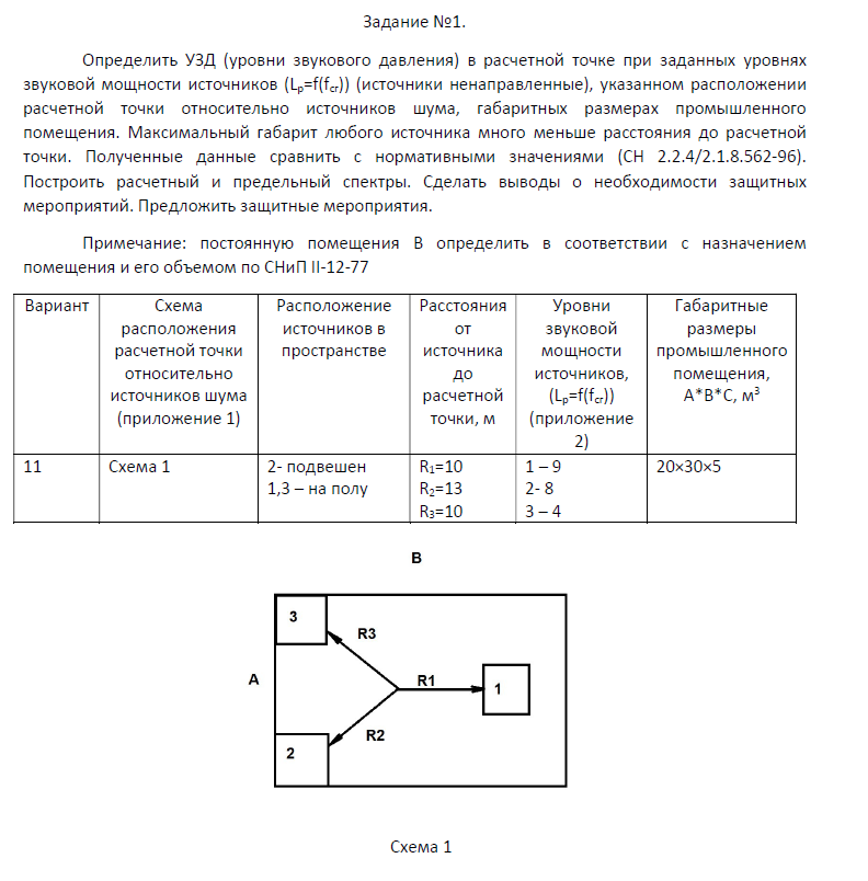 Определить УЗД (уровни звукового давления) в расчетной точке при заданных уровнях звуковой мощности источников (Lp=f(fсг)) (источники ненаправленные), указанном расположении расчетной точки относительно источников шума, габаритных размерах промышленного помещения. Максимальный габарит любого источника много меньше расстояния до расчетной точки. Полученные данные сравнить с нормативными значениями (СН 2.2.4/2.1.8.562-96). Построить расчетный и предельный спектры. Сделать выводы о необходимости защитных мероприятий. Предложить защитные мероприятия. Примечание: постоянную помещения В определить в соответствии с назначением помещения и его объемом по СНиП II-12-77...