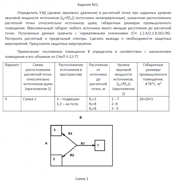 Определить УЗД (уровни звукового давления) в расчетной точке при заданных уровнях звуковой мощности источников (Lp=f(fсг)) (источники ненаправленные), указанном расположении расчетной точки относительно источников шума, габаритных размерах промышленного помещения. Максимальный габарит любого источника много меньше расстояния до расчетной точки. Полученные данные сравнить с нормативными значениями (СН 2.2.4/2.1.8.562-96). Построить расчетный и предельный спектры. Сделать выводы о необходимости защитных мероприятий. Предложить защитные мероприятия. Примечание: постоянную помещения В определить в соответствии с назначением помещения и его объемом по СНиП II-12-77...