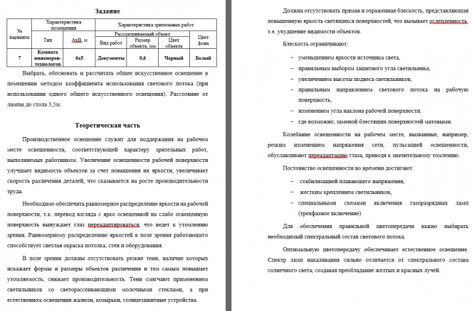 Характеристика помещения Характеристика зрительных работ Тип АхВ, м Рассматриваемый объект Цвет фона Вид работ Размер объекта, мм Цвет объекта 7 Комната инженеров-технологов 6х5 Документы 0,6 Черный Белый Выбрать, обосновать и рассчитать общее искусственное освещение в помещении методом коэффициента использования светового потока (при использовании одного общего искусственного освещения). Расстояние от лампы до стола 3,5м. Расчет искусственного освещения .
