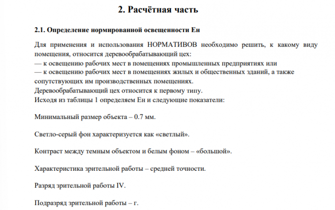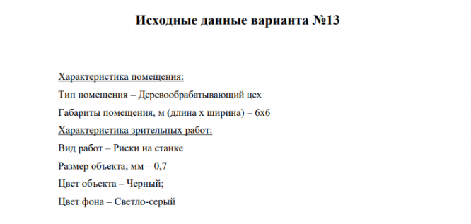 Характеристика помещения: Тип помещения - Деревообрабатывающий цех Габариты помещения, м (длина х ширина) 6х6 Характеристика зрительных работ: Вид работ –Риски на станке Размер объекта, мм –0,7 Цвет объекта – Черный; Цвет фона –Светло-серый