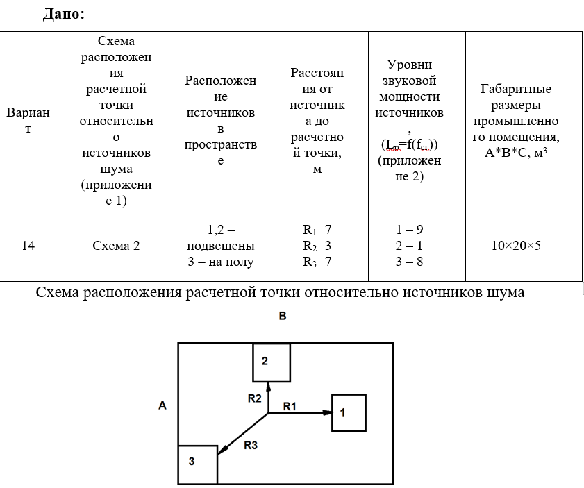 Определить УЗД (уровни звукового давления) и уровень звука в расчетной точке при заданных уровнях звуковой мощности источников (Lp=f(fсг)) (источники ненаправленные), указанном расположении расчетной точки относительно источников шума, габаритных размерах помещения производственного предприятия. Максимальный габарит любого источника много меньше расстояния до расчетной точки. Полученные данные сравнить с нормативными значениями (СП51.13330.2011). Построить расчетный и предельный спектры. Сделать выводы о необходимости защитных мероприятий. Предложить защитные мероприятия.