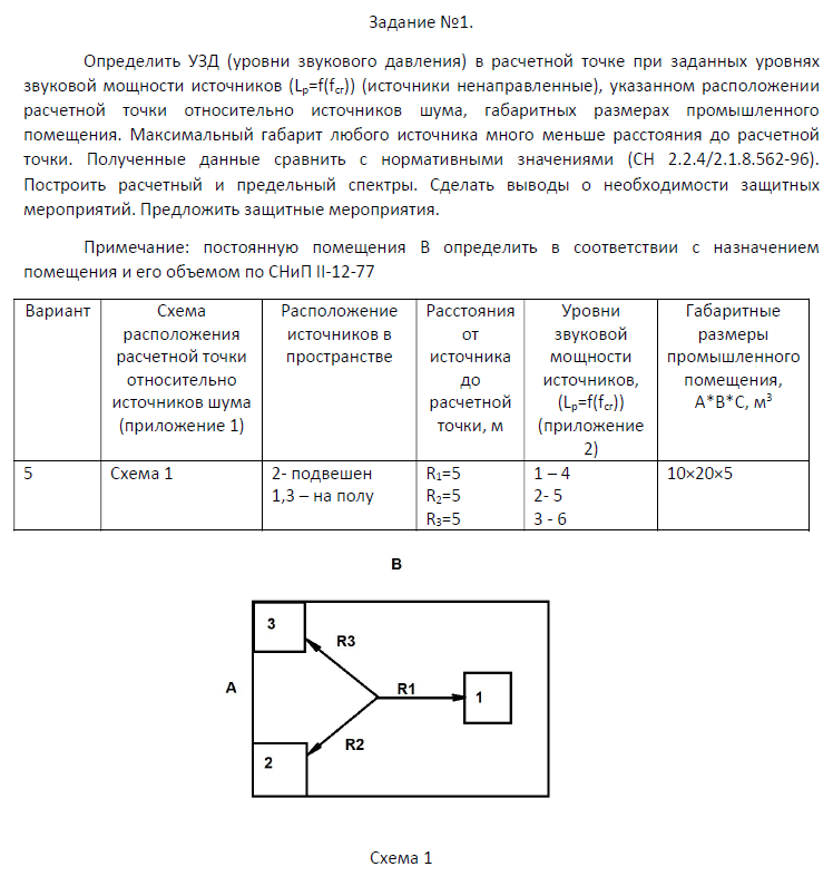 Определить УЗД (уровни звукового давления) в расчетной точке при заданных уровнях звуковой мощности источников (Lp=f(fсг)) (источники ненаправленные), указанном расположении расчетной точки относительно источников шума, габаритных размерах промышленного помещения. Максимальный габарит любого источника много меньше расстояния до расчетной точки. Полученные данные сравнить с нормативными значениями (СН 2.2.4/2.1.8.562-96). Построить расчетный и предельный спектры. Сделать выводы о необходимости защитных мероприятий. Предложить защитные мероприятия. Примечание: постоянную помещения В определить в соответствии с назначением помещения и его объемом по СНиП II-12-77...