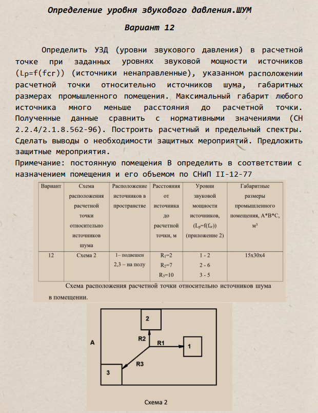 Определить УЗД (уровни звукового давления) в расчетной точке при заданных уровнях звуковой мощности источников (Lp=f(fсг)) (источники ненаправленные), указанном расположении расчетной точки относительно источников шума, габаритных размерах промышленного помещения. Максимальный габарит любого источника много меньше расстояния до расчетной точки. Полученные данные сравнить с нормативными значениями (СН 2.2.4/2.1.8.562-96). Построить расчетный и предельный спектры. Сделать выводы о необходимости защитных мероприятий. Предложить защитные мероприятия. Примечание: постоянную помещения В определить в соответствии с назначением помещения и его объемом по СНиП II-12-77 .