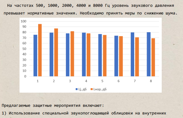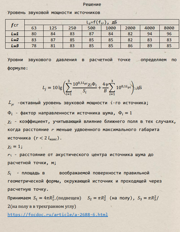 Определить УЗД (уровни звукового давления) в расчетной точке при заданных уровнях звуковой мощности источников (Lp=f(fсг)) (источники ненаправленные),указанном расположении расчетной точки относительно источников шума, габаритных размерах промышленного помещения. Максимальный габарит любого источника много меньше расстояния до расчетной точки. Полученные данные сравнить с нормативными значениями (СН 2.2.4/2.1.8.562-96). Построить расчетный и предельный спектры. Сделать выводы о необходимости защитных мероприятий. Предложить защитные мероприятия.