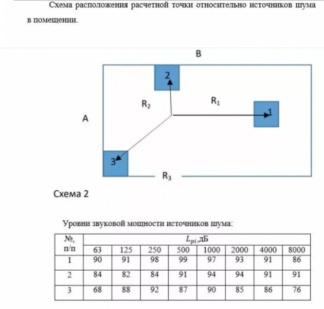 Определить УЗД (уровни звукового давления) в расчетной точке при заданных уровнях звуковой мощности источников (Lр=f(fcr)) (источники ненаправленные), указанном расположении расчетной точки относительно источников шума, габаритных размерах промышленного помещения. Максимальный габарит любого источника много меньше расстояния до расчетной точки. Полученные данные сравнить с нормативными значениями (СП 51.13330.2011). Построить расчетный и предельный спектры. Сделать выводы о необходимости защитных мероприятий. Предложить защитные мероприятия.