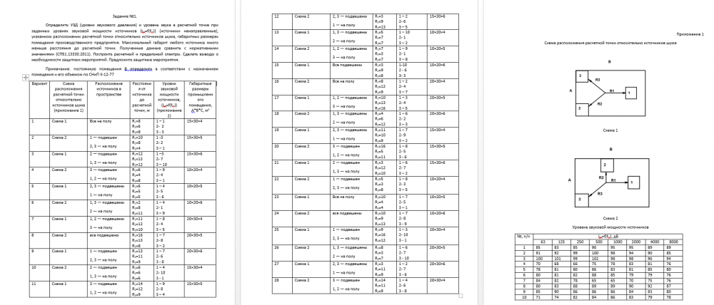 Определить УЗД (уровни звукового давления) и уровень звука в расчетной точке при заданных уровнях звуковой мощности источников (Lp=f(fсг)) (источники ненаправленные), указанном расположении расчетной точки относительно источников шума, габаритных размерах помещения производственного предприятия. Максимальный габарит любого источника много меньше расстояния до расчетной точки. Полученные данные сравнить с нормативными значениями (СП51.13330.2011). Построить расчетный и предельный спектры. Сделать выводы о необходимости защитных мероприятий. Предложить защитные мероприятия. ![]()