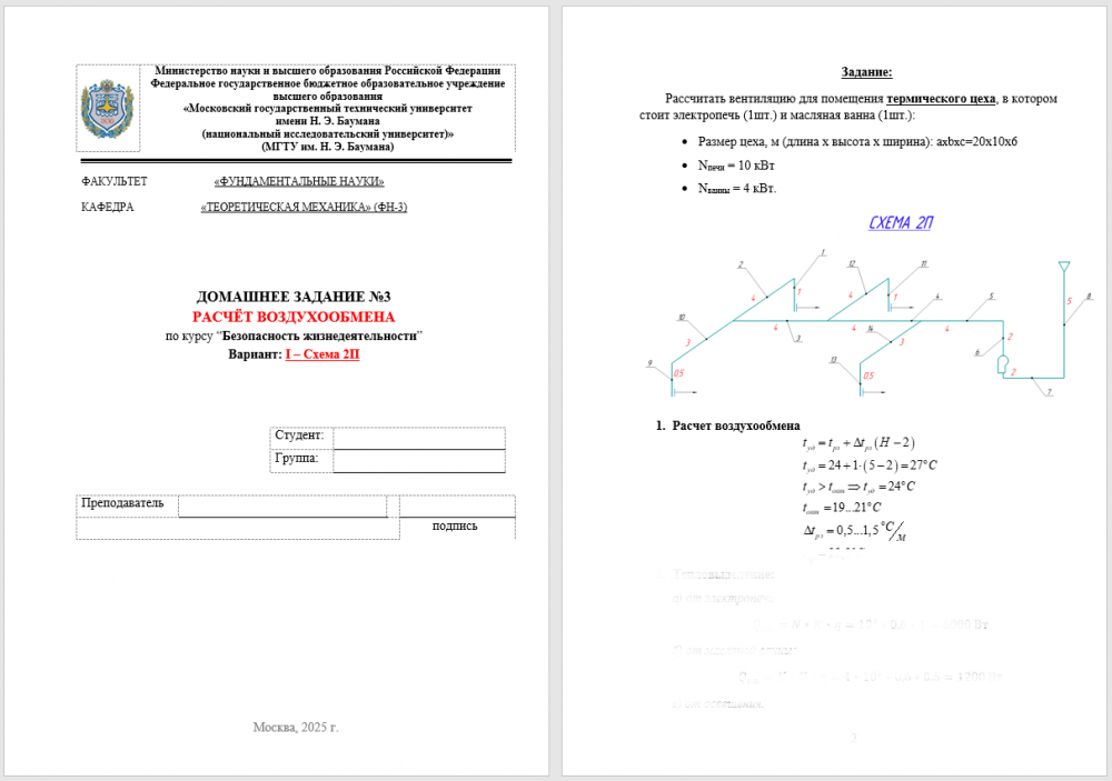 Для студентов МГТУ им. Н.Э.Баумана по предмету Безопасность жизнедеятельности (БЖД и ГРОБ или ОБЖ)Расчёт воздухообмена термического цеха (Вариант I - Схема 2П)Расчёт воздухообмена термического цеха (Вариант I - Схема 2П)