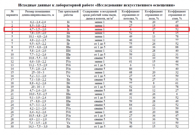 Рассчитать общее равномерное искусственное освещение для производственного помещения. Длина помещения, ширина, высота представлены в таблице. В помещении проводятся работы определенного разряда. В таблице также для каждого варианта представлено содержание в воздушной среде рабочей зоны пыли, дыма и копоти, коэффициенты отражения от потолка, стен и пола.