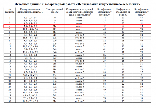 Рассчитать общее равномерное искусственное освещение для производственного помещения. Длина помещения, ширина, высота представлены в таблице. В помещении проводятся работы определенного разряда. В таблице также для каждого варианта представлено содержание в воздушной среде рабочей зоны пыли, дыма и копоти, коэффициенты отражения от потолка, стен и пола.